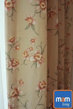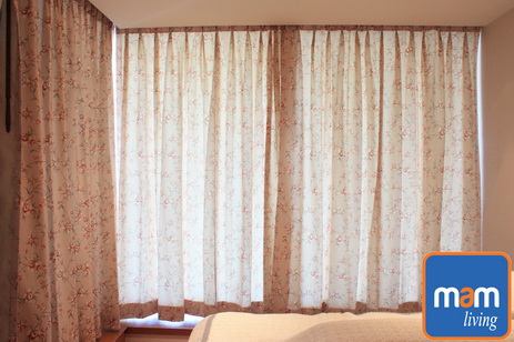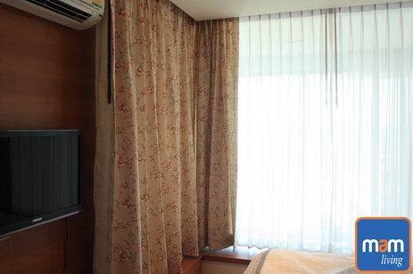 มาดูที่ห้องนอนกันบ้างครับ ผ้าม่านที่ใช้มาจาก VC Fabric เช่นกัน พื้นผ้าสีครีมพิมพ์ลายดอกไม้ ทำให้ห้องที่มีขนาดเล็กมีลูกเล่นมากขึ้น