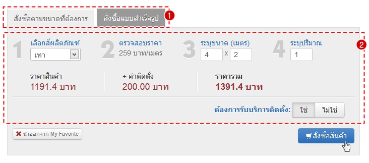- เลือกสั่งสินค้าแบบตามขนาดที่ต้องการหรือแบบสำเร็จรูป แล้วกรอกรายละเอียดของสินค้าให้ครบถ้วน เช่นสี ขนาด จำนวน เป็นต้น แล้วเลือกว่าจะรับบริการติดตั้งด้วยหรือไม่ แล้วจึงกดสั่งซื้อสินค้า