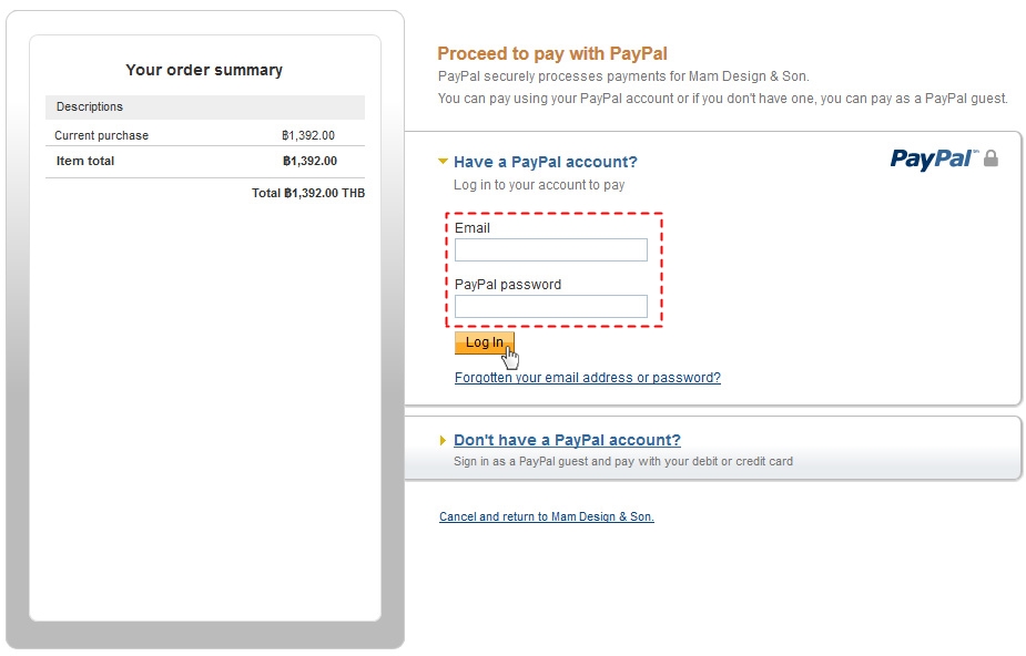 - หากคุณมีบัญชี Paypal อยู่แล้ว คุณสามารถกรอกอีเมลและรหัสผ่านเพื่อเข้าสู่ระบบ Paypal ได้ทันที