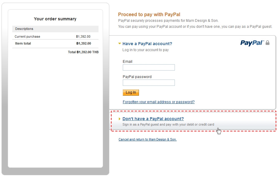 - หรือหากคุณยังไม่มีบัญชี Paypal คุณสามารถคลิกที่ลิงค์ด้านล่างเพื่อชำระเงินผ่านบัตรเครดิตโดยไม่ต้องใช้บัญชี Paypal