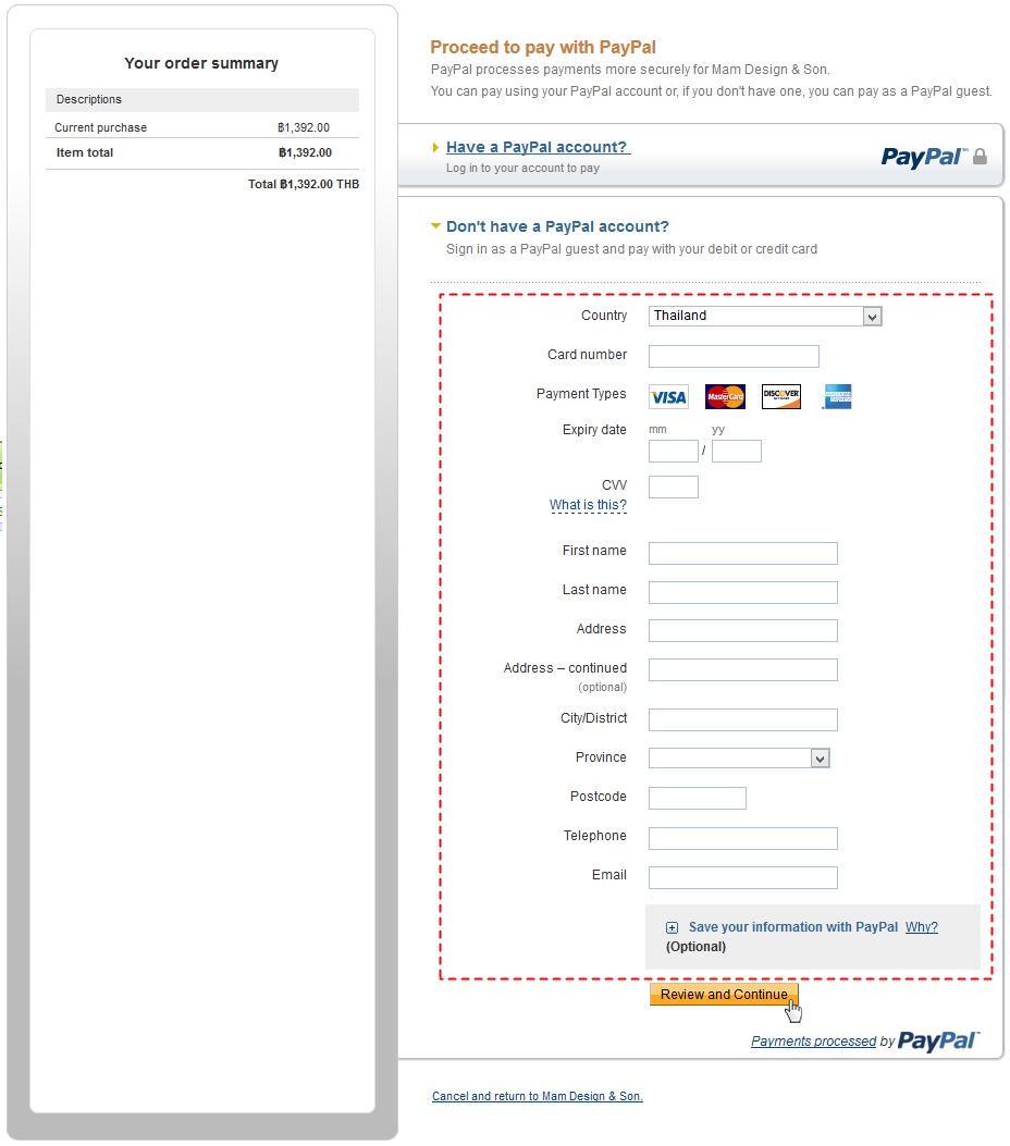 - ในกรณีที่คุณไม่มีบัญชี Paypal คุณสามารถกรอกรายละเอียดบัตรเครดิตได้ที่หน้านี้ แล้วคลิก Review and Continue เพื่อเตรียมชำระเงิน