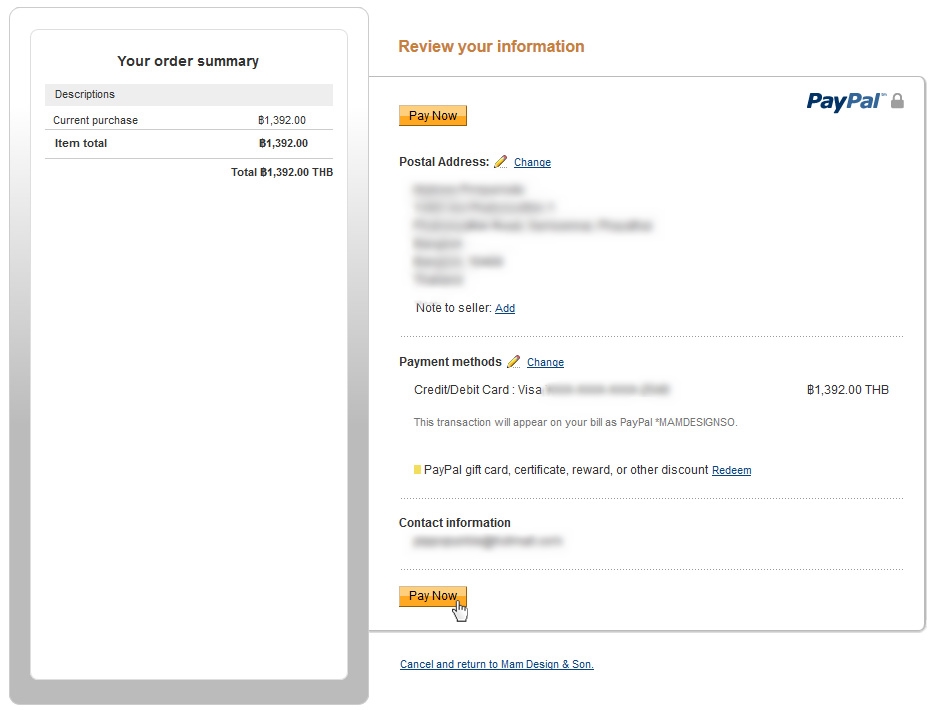 - หลังจากล็อกอินเข้าสู่ระบบ Paypal หรือกรอกรายละเอียดบัตรเครดิตเรียบร้อยแล้ว ระบบจะนำมายังหน้ายืนยันรายละเอียดเพื่อให้คุณตรวจสอบรายละเอียดต่างๆ ให้ถูกต้อง แล้วจึงคลิก Pay Now