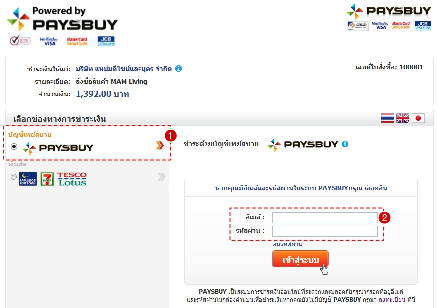 - เลือกช่องทางการชำระเงินผ่าน Paysbuy แล้วกรอกอีเมลและรหัสผ่าน เพื่อล็อกอินเข้าสู่บัญชี Paysbuy ของคุณ