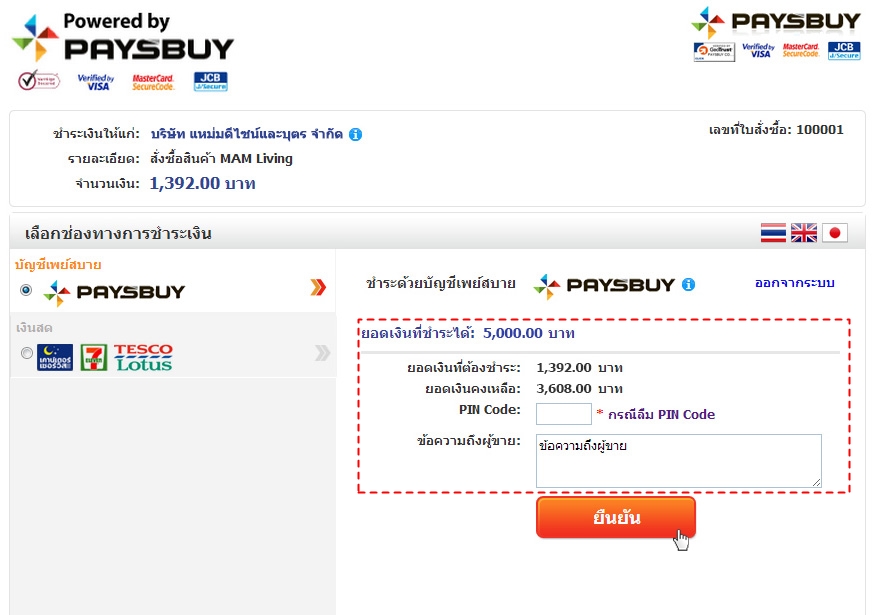 - ตรวจสอบยอดเงินในบัญชี Paysbuy ของคุณและยอดเงินที่ต้องชำระให้ถูกต้อง แล้วกรอก Pin Code 4 หลัก จากนั้นจึงกด ยืนยัน